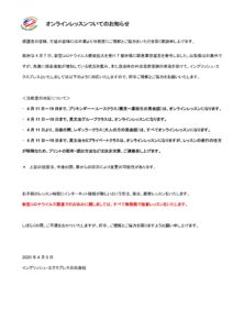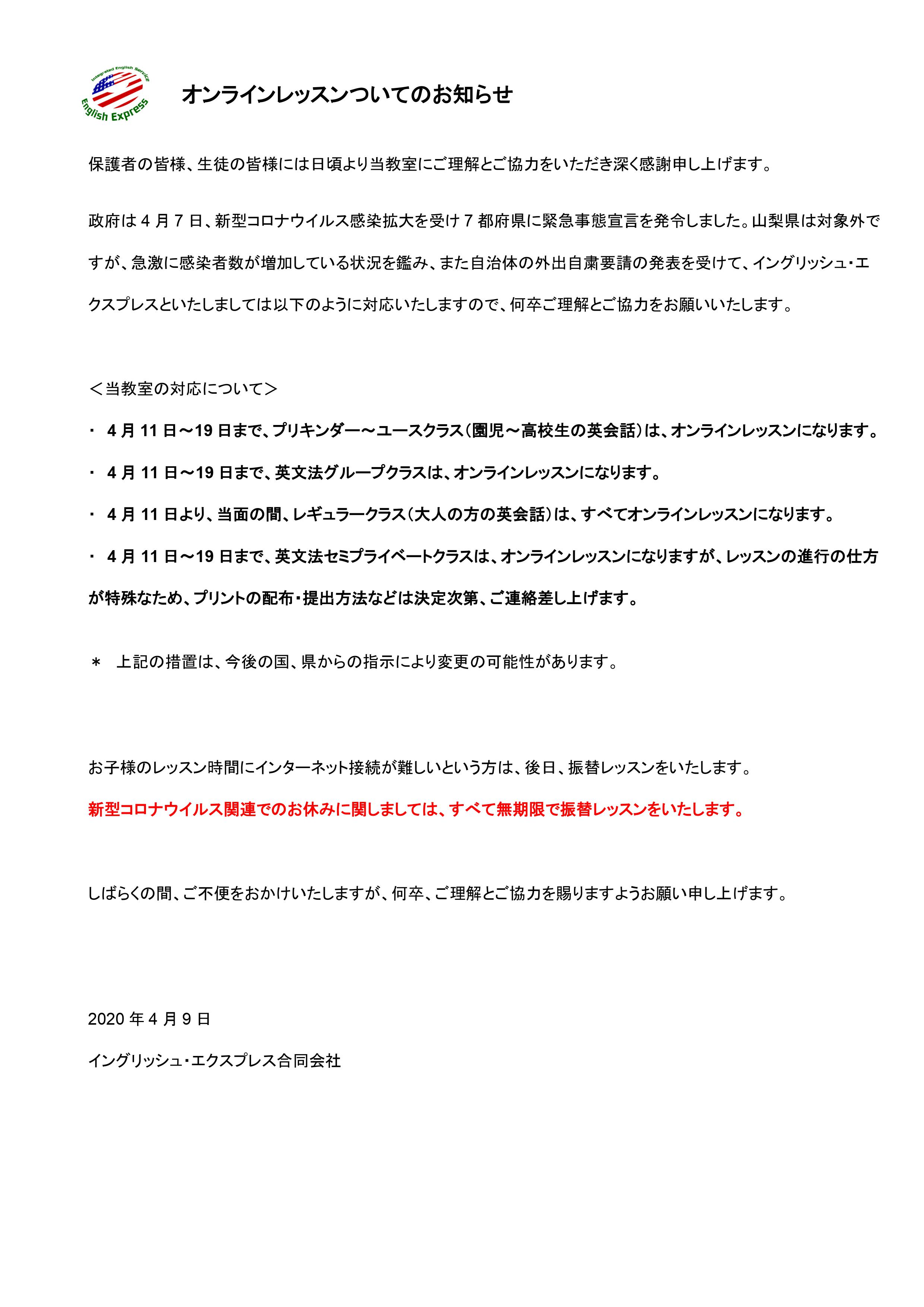 現在、山梨県内での新型コロナウイルス感染が拡大している状況を鑑み、 また自治体の外出自粛要請の発表を受けて、 イングリッシュ・エクスプレスといたしましては以下のように対応いたします。 何卒ご理解とご協力をお願いいたします。