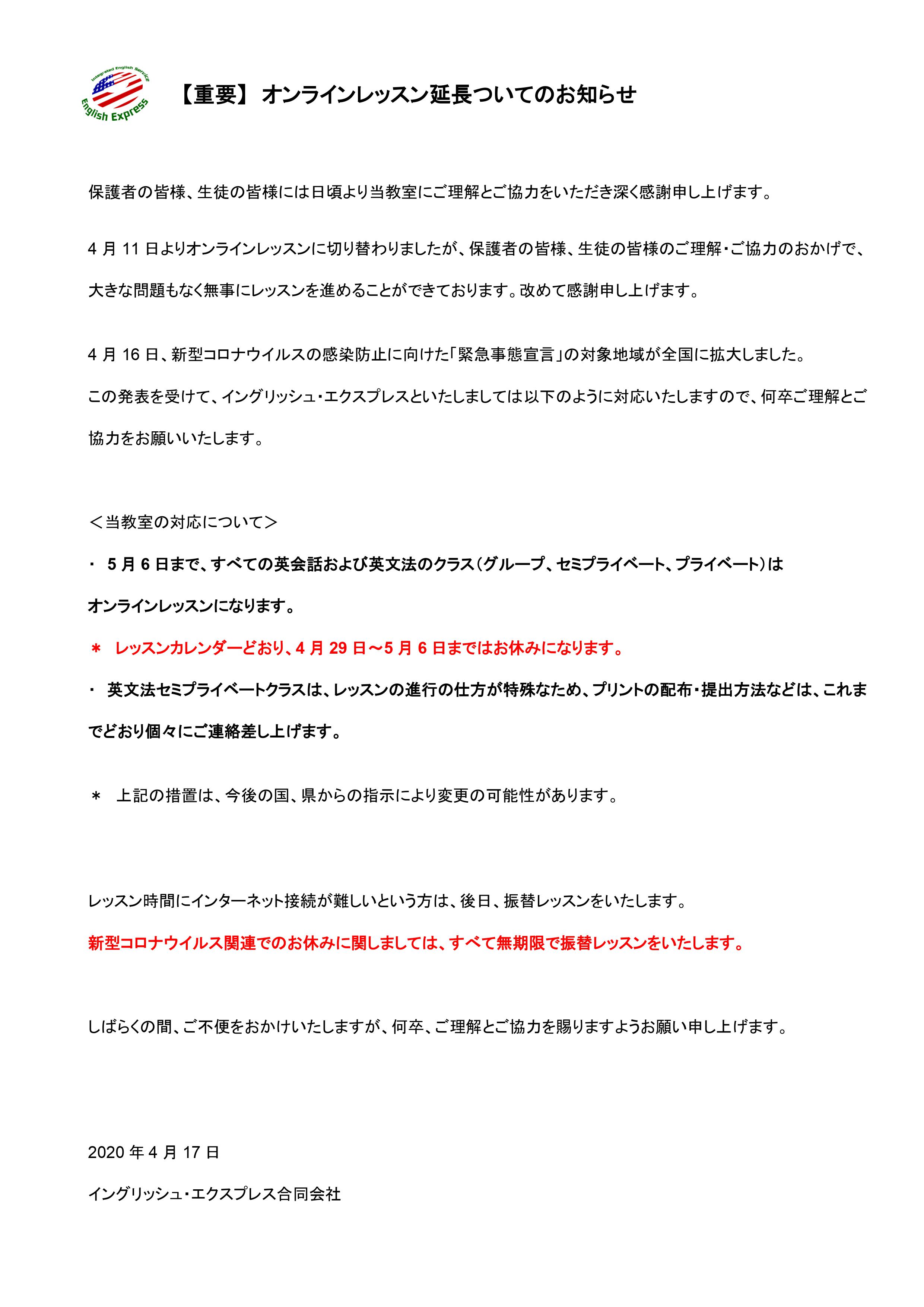 4月16日、新型コロナウイルスの感染防止に向けた 「緊急事態宣言」の対象地域が全国に拡大しました。 この発表を受けて、 イングリッシュ・エクスプレスといたしましては以下のように対応いたします。 何卒ご理解とご協力をお願いいたします。