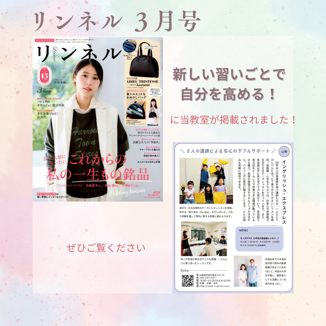 山梨県甲府市の英語・英会話スクール「English Express」。アメリカ人とバイリンガル日本人の講師で安心ダブルサポート!英語学習で求めいていたものがここで見つかります。