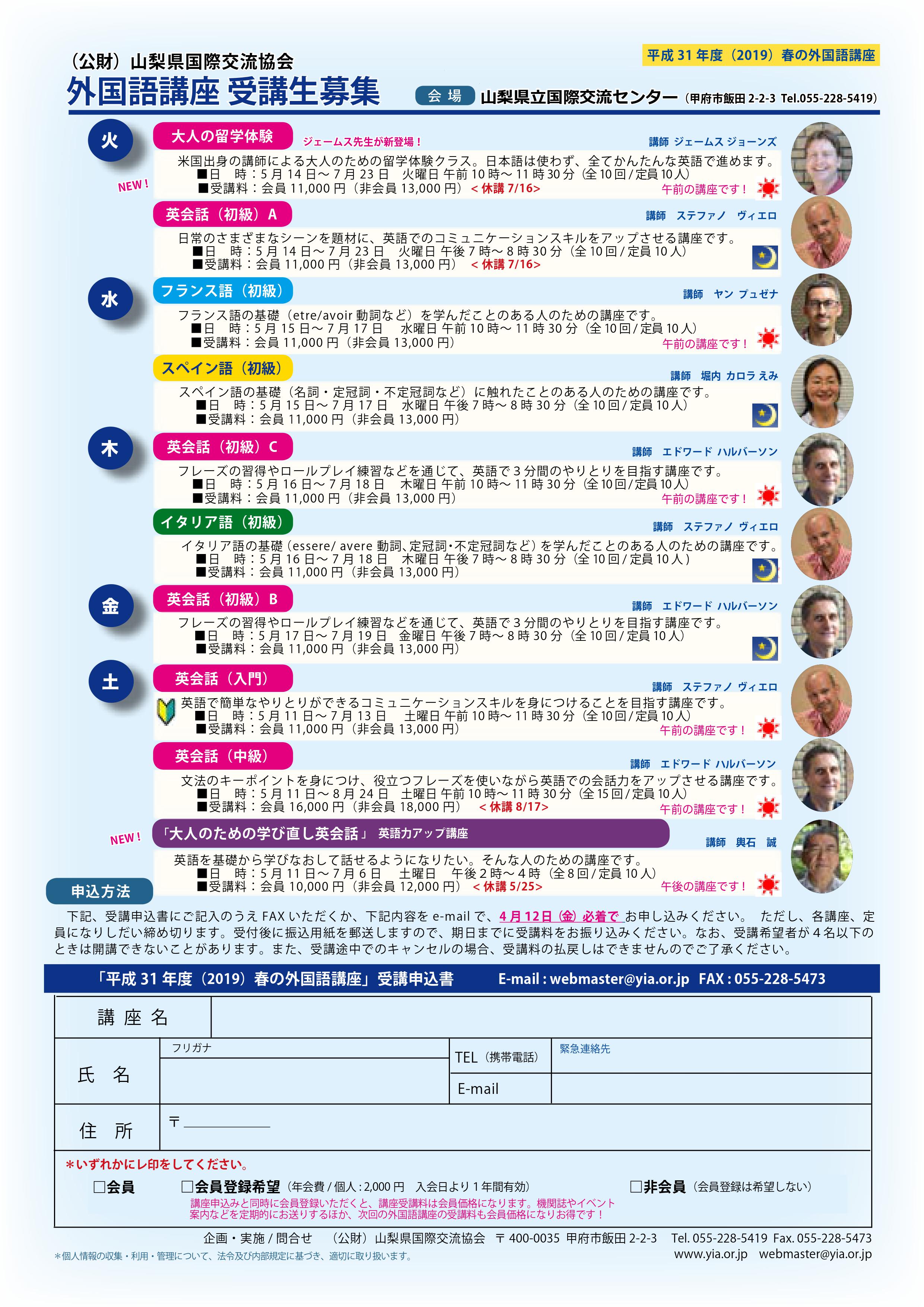 5月より、山梨県立国際交流協会主催「平成31年度 春の外国語講座」にジム先生が講師としてお伺いしています。 「大人の留学体験」というタイトルのクラスです(満員)。 貴重な機会に感謝しながら頑張らせていただいております。 また、この経験を普段のレッスンにも生かしていきたいと思います。